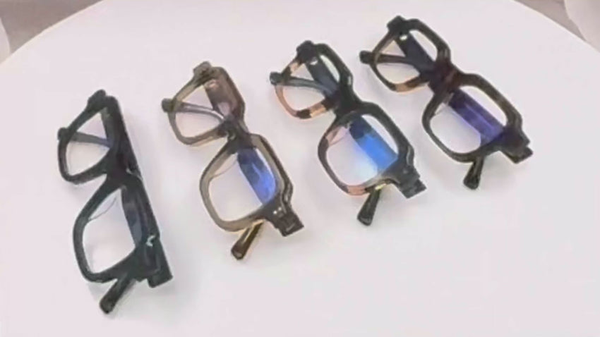 Acetate, hand crafted eyewear with stainless steel riveted hinge work.